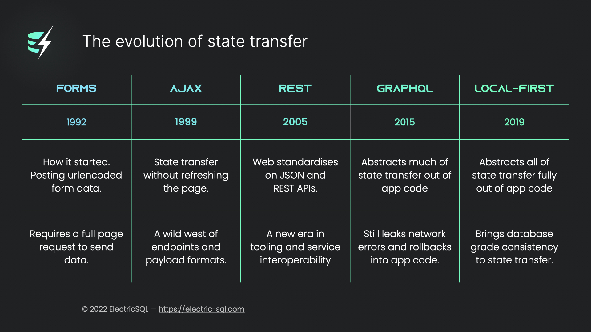 Local-first software is a new paradigm that fully abstracts state transfer out of the application domain. It's the endgame for the evolution of state transfer and the vision we're building towards with ElectricSQL.